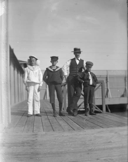 Enligt text som medföljde bilden: "Lysekil, Gustaf, Thomas, Frej och Sven i herrbassinen, 1898".