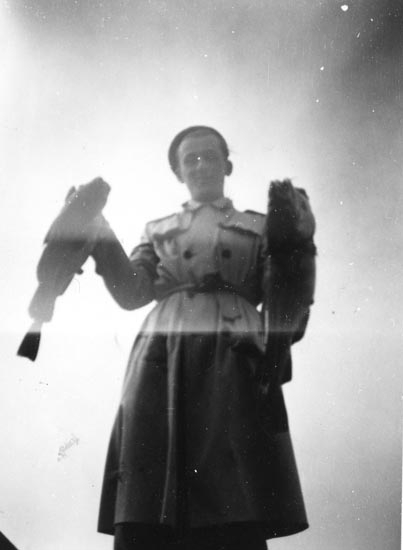 Fred Lundström håller upp två nyfångade fiskar. Lundström var ledsagare för konstnären Inge Schiöler på dennes permissioner från S:t Jörgens sjukhus