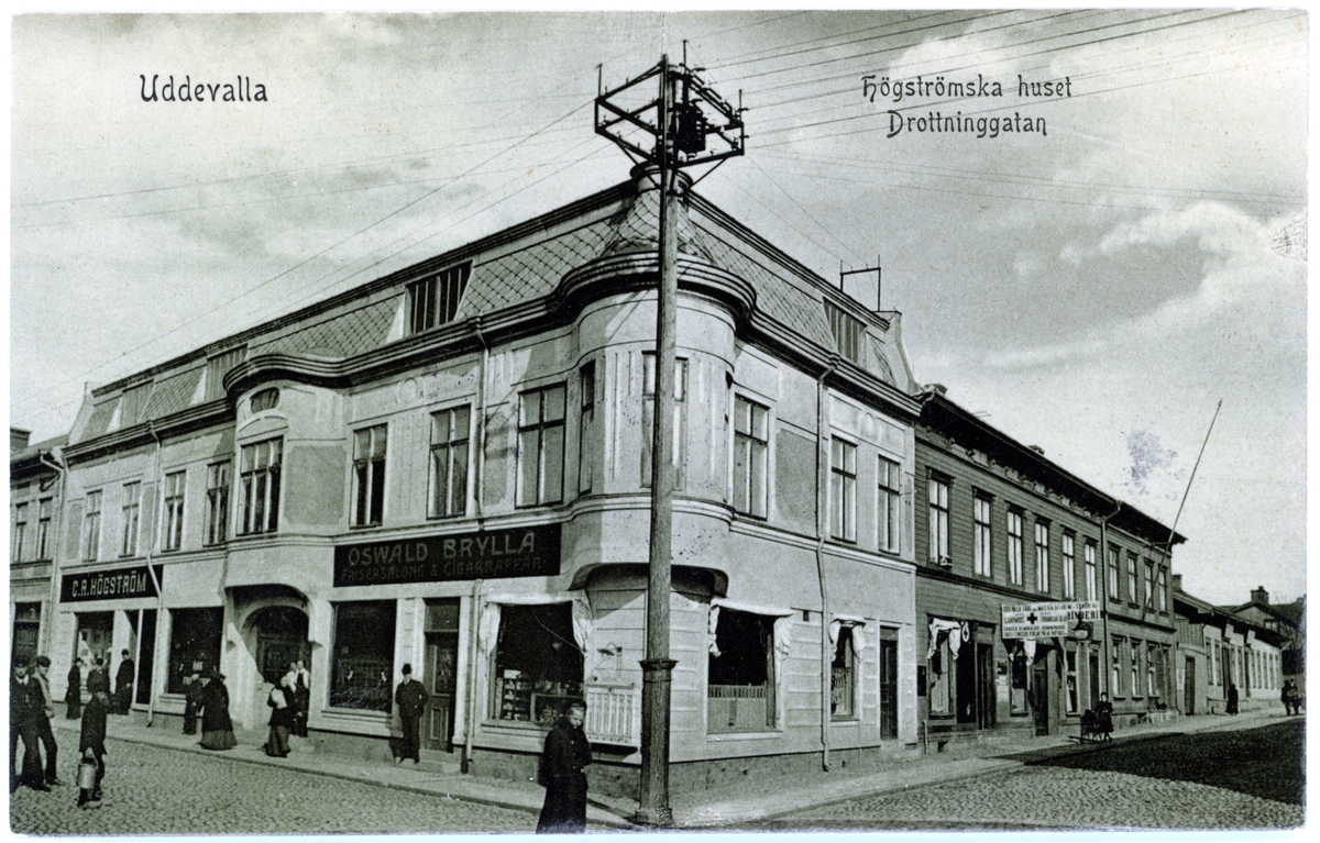 Tryckt text på vykortets framsida: "Uddevalla Högströmska huset Drottninggatan".