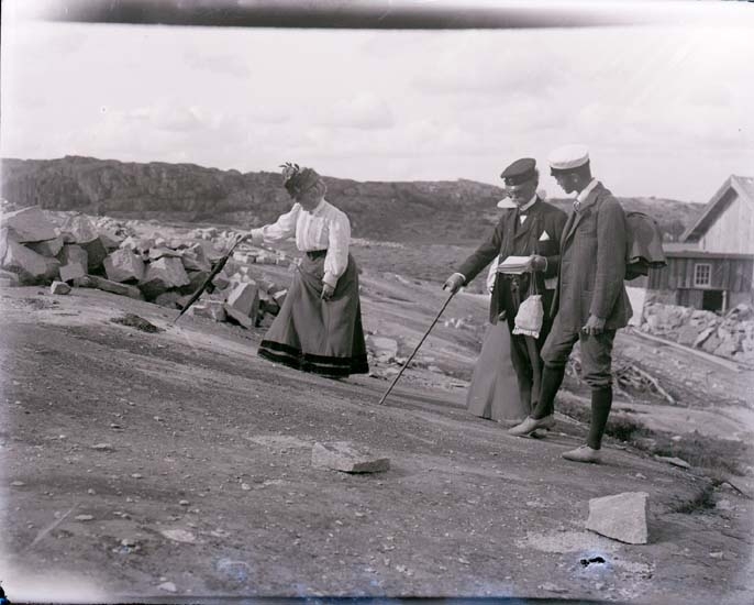 Enligt text som medföljde bilden: "Professorskan Calla Curman pekar indignerad på misshandlade hällristningar av stenhuggare i Brastad. Thor och Gerhard Odencrantz c:a