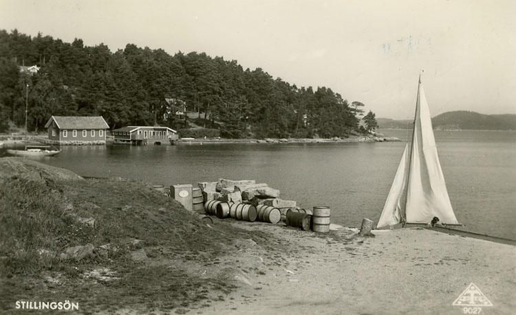 Enligt Bengt Lundins noteringar: "Stillingsön. Segelbåt och tunnor vid bryggan".