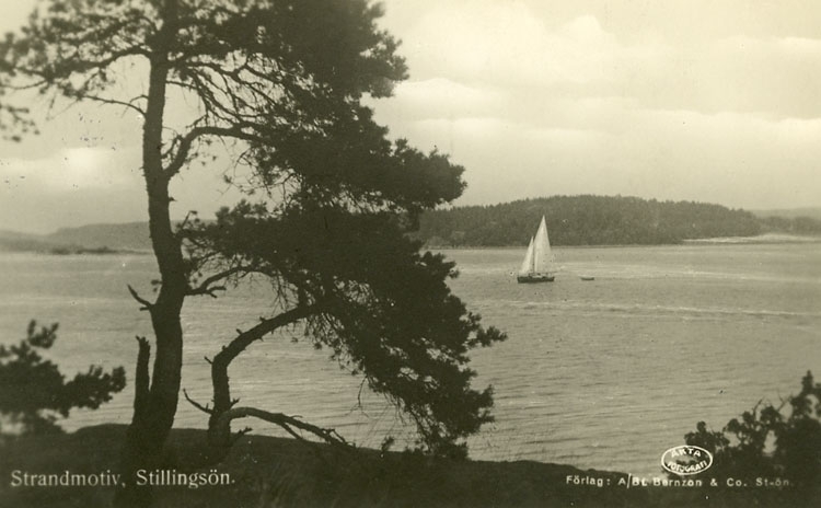 Enligt Bengt Lundins noteringar: "Stillingsön. Två tallar och en segelbåt".