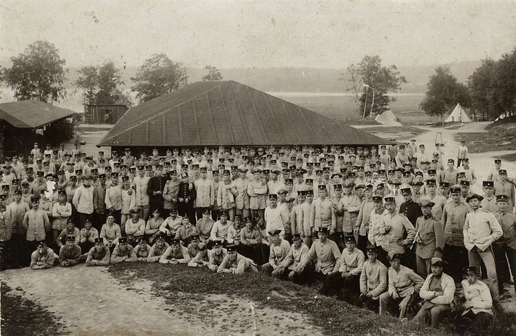 Enligt Bengt Lundins noteringar: "Grupp framför matsal 2. I bakgrunden skulbod".