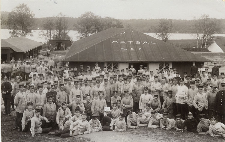 Enligt Bengt Lundins noteringar: "Grupp framför matsal 2. I bakgrunden skulbod".