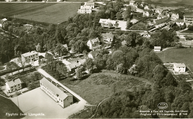 Enligt Bengt Lundins noteringar: "Flygfoto över Ljungskile. Skolan. Centrum".