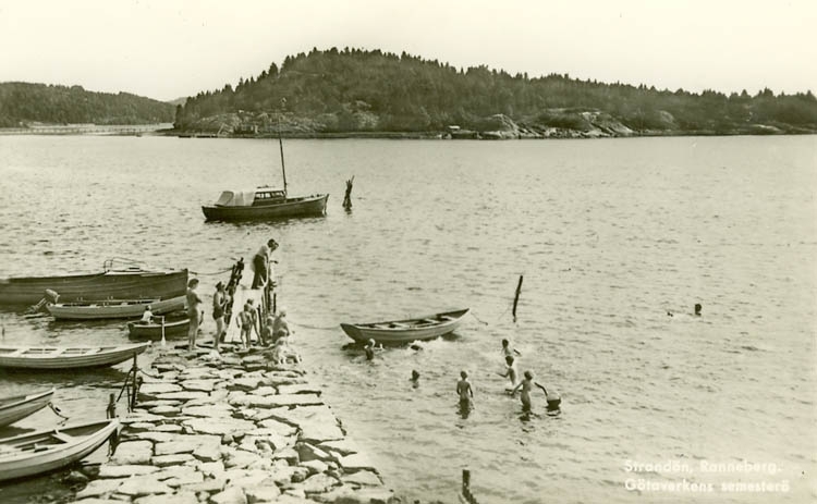 Enligt Bengt Lundins noteringar: "Strandön, Ramneberg. Götaverkens semesterö. Badbryggan".