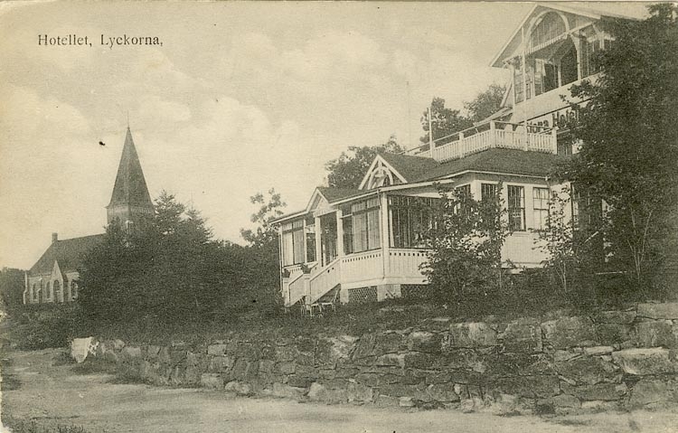 Enligt Bengt Lundins noteringar: "Hotellet från sjösidan. Kyrkan. Lyckorna".