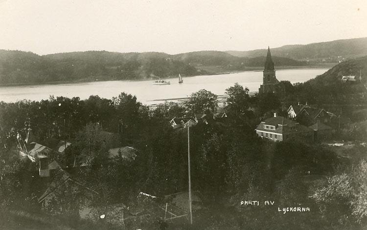 Enligt Bengt Lundins noteringar: "Parti av Lyckorna. Restaurangen, Valås och två båtar".