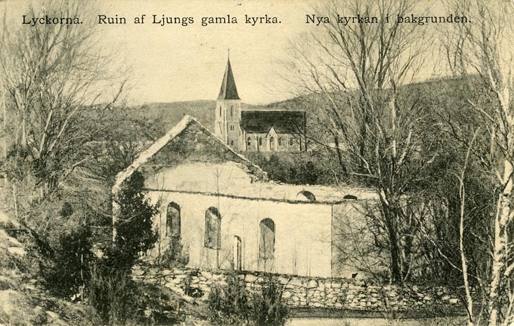 Enligt Bengt Lundins noteringar: "Lyckorna. Ruin af Ljungs gamla kyrka. Nya kyrkan i bakgrunden".