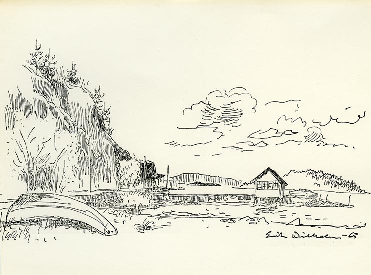 Text på kortets baksida: "Strandpromenaden, Ljungskile. Ur Erik Wilhelms skissbok".