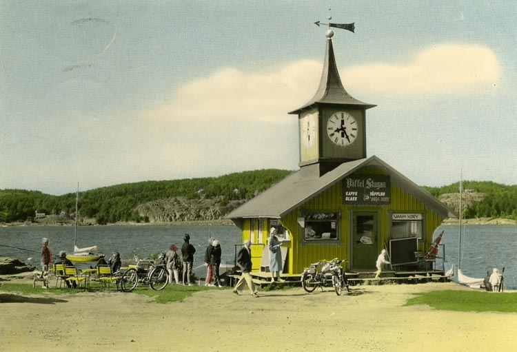Enligt Bengt Lundins noteringar: "Klocktornet. Våffelstuga med moped. Lyckorna".