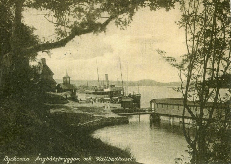 Enligt Bengt Lundins noteringar: "Lyckorna. Ångbåtsbryggan och kallbadhuset. Uddevalla vid bron".