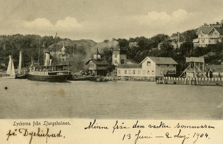 Enligt Bengt Lundins noteringar: "Lyckorna från Ljungholmen. SS Kung Rane med segelbåtar vid ångbåtsbryggan".