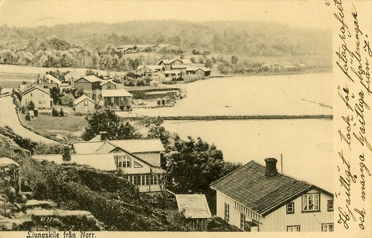 Enligt Bengt Lundins noteringar: "Ljungskile från norr. 1. Bagare Ljungbergs villa och bnageri. 2. Annelund".