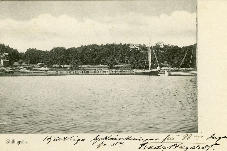 Enligt Bengt Lundins noteringar: "Stillingsön. Vikens inre del med båtar"