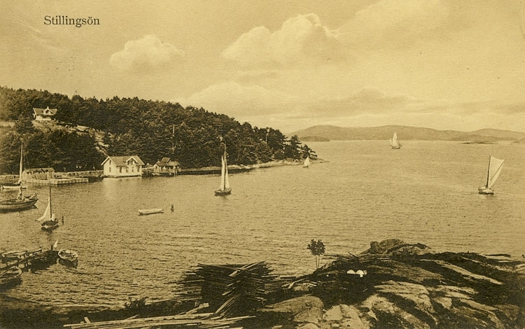 Enligt Bengt Lundins noteringar: "Stillingsön. Utsikt mot badhuset och fjorden"