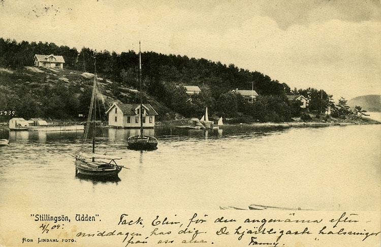 Enligt Bengt Lundins noteringar: "Stillingsön. Udden. Vy mot badhusen. Två båtar i förgrunden"