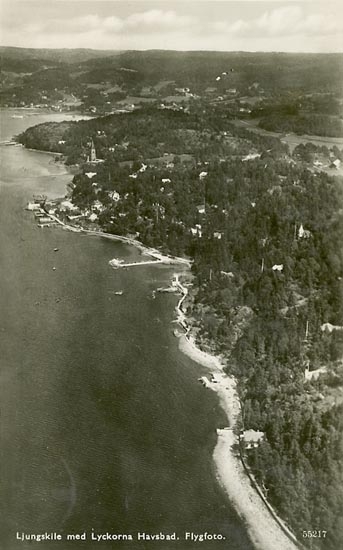 Enligt Bengt Lundins noteringar: "Ljungskile med Lyckorna Havsbad. Flygfoto".