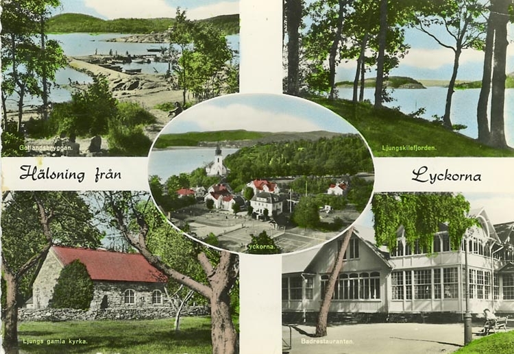 Enligt Bengt Lundins noteringar: "Hälsning från Lyckorna. Gotlandsbryggan. Ljungskilefjorden. Ljungs gamla kyrka. Badrestauranten. 5-Bild".