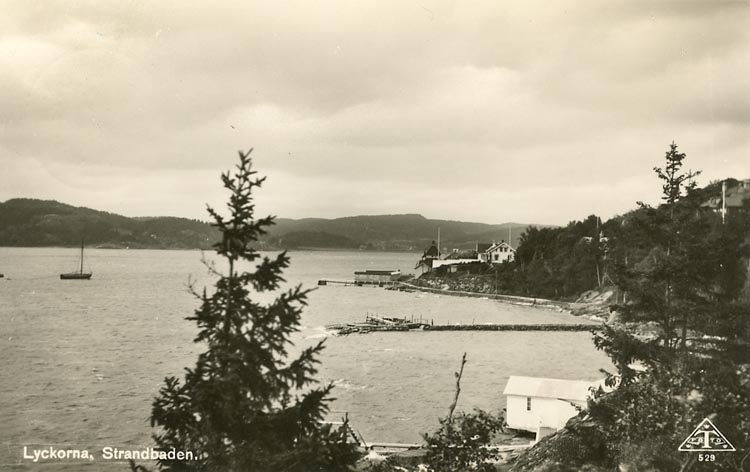 Enligt Bengt Lundins noteringar: "Lyckorna. Strandbaden med bryggor".