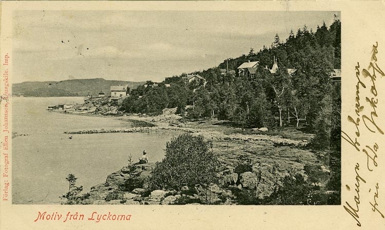 Enligt Bengt Lundins noteringar: "Motiv från Lyckorna. Herrbadhus - Underås".