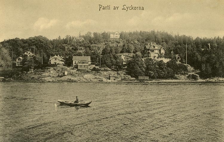 Titel: Enligt Bengt Lundins noteringar: "Parti av Lyckorna. Havsvik. Furuhäll, Björkås nyuppfört, Lyckeberg och Havsvik ej ombyggda, Fridhem tillbyggt, Karlslund borta, Agnesberg skymt av träd".