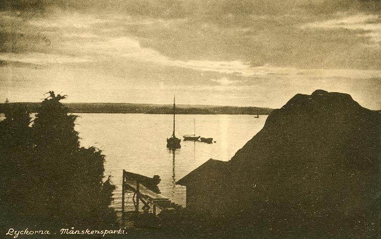 Enligt Bengt Lundins noteringar: "Lyckorna. Månskensparti. Brygga och båtar".