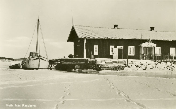 Enligt Bengt Lundins noteringar: "Ranebergs brygga i vinterskrud".