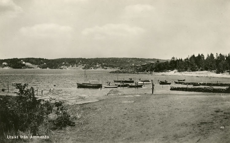 Enligt Bengt Lundins noteringar: "Utsikt från Ammenäs. Sandstrand med småbåtar".
