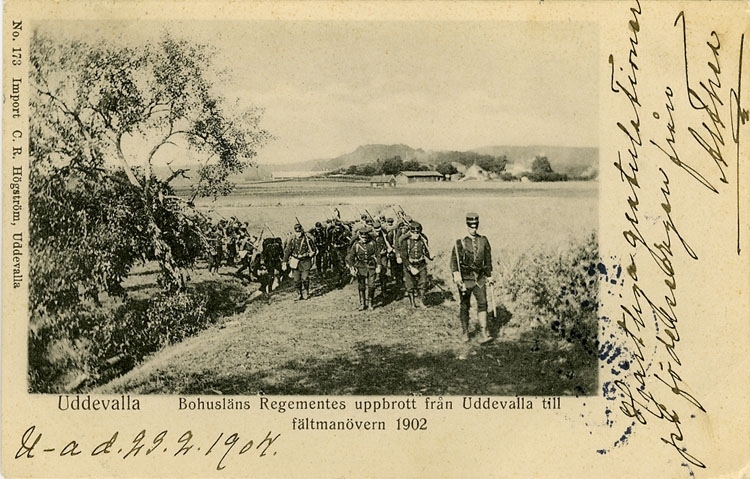 Enligt Bengt Lundins noteringar:"Uddevalla. Bohusläns Regemente uppbrott från Uddevalla till fältmanövern 1902. Fältmanöver i Närke. Marsch".