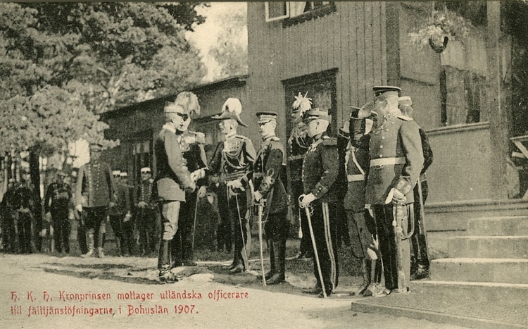 Enligt Bengt Lundins noteringar: "Från "Kriget" i Bohuslän. Kronprinsen tar emot utländska officerare".