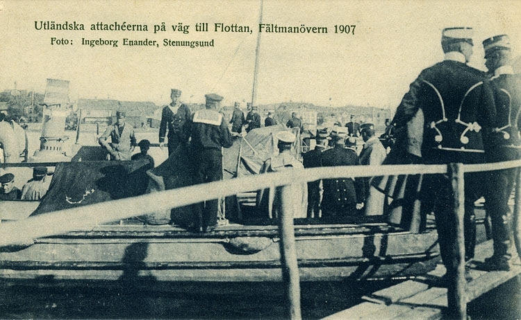 Enligt Bengt Lundins noteringar: "Från"Kriget" i Bohuslän 1907. Utländska Attachéerna på väg till Flottan, Fältmanövern 1907".