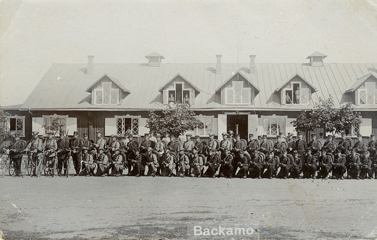 Enligt Bengt Lundins noteringar: "Backamo. Uppställning framför 2:a manskapsbaracken".