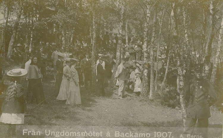 Enligt Bengt Lundins noteringar: "Från ungdomsmötet på Backamo, 1907. Stående nedanför officersmässen".