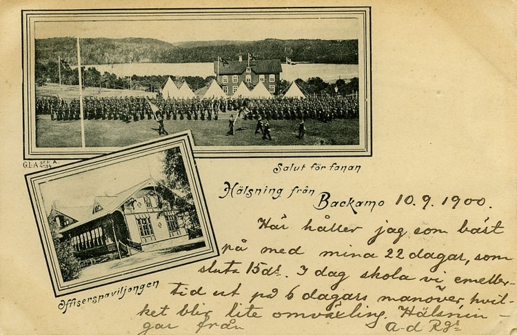 Enligt Bengt Lundins noteringar: "Salut för fanan. Officerspaviljongen. 2-bild".