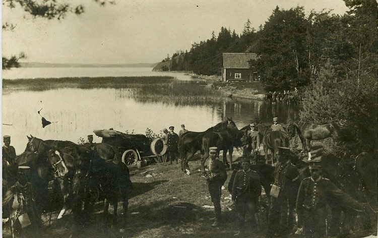 Enligt Bengt Lundins noteringar: "Från "kriget" i Bohuslän 1907. Rastning vid en sjö med hästar och bil".