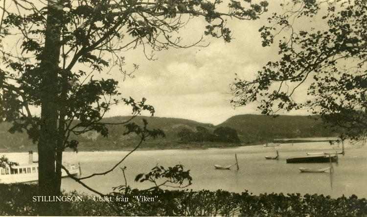 Enligt Bengt Lundins noteringar: "Stillingsön. Utsikt från viken.S/S Brage för ankar"