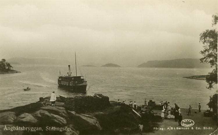 Enligt Bengt Lundins noteringar: "Ångbåtsbryggan, Stillingsön. Båten anländer"