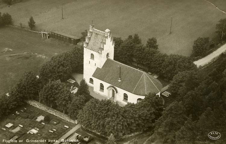 Enligt Bengt Lundins noteringar: "Flygfoto av Grinneröds kyrka. Bohuslän.