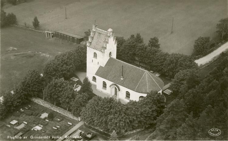 Enligt Bengt Lundins noteringar: "Flygfoto av Grinneröds kyrka. Bohuslän".