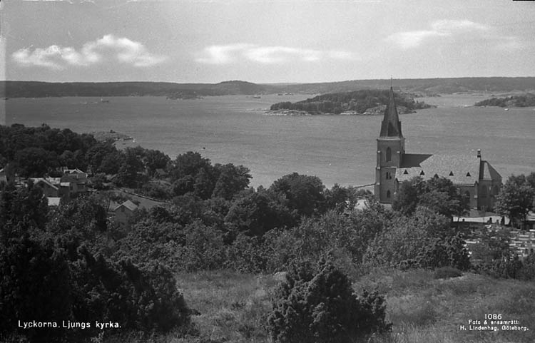 Enligt Bengt Lundins noteringar: "Lyckorna. Ljungs kyrka med buskar. Vykort Li 1086 Foto BL 1751".