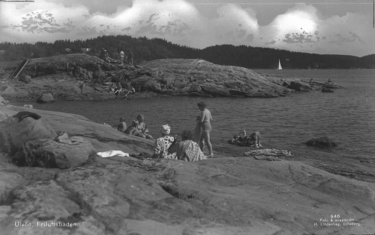 Enligt Bengt Lundins noteringar: "Öns badplats med paviljong. Ulvöns badande damer. Vykort Li 946 BL 1297".