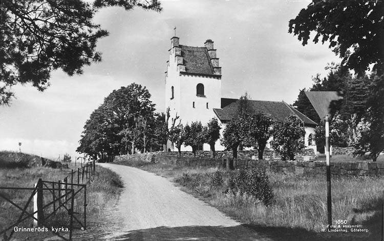 Enligt Bengt Lundins noteringar: "Grinneröd. Kyrka. Vykort Li 1050 Foto BL 27".