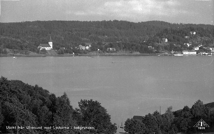 Enligt Bengt Lundins noteringar: "Ulvesund. Utsikt från Ulvesund med Lyckorna i bakgrunden. Vykort TF 7809 BL 1319".