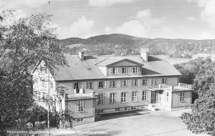 Enligt Bengt Lundins noteringar: "Ljungskile. Västkustens ungdomsskola huvudbyggnad med balkong. Vykort TF 2556 BL 1030".