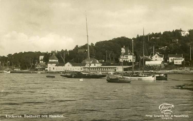 Enligt Bengt Lundins noteringar: "Lyckorna. Badhuset och hamnen. Fyra segelbåtar".