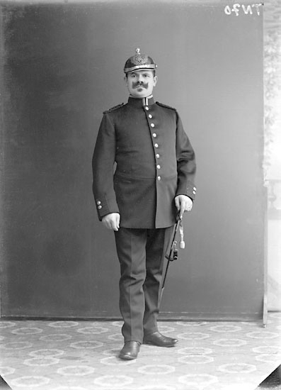 Enligt senare noteringar: "Ateljéfoto. Polisman, av högre grad, i uniform med kask."