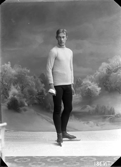 Enligt tidigare noteringar: "Ateljéfoto av Thorvald Adrians skridskoklädd för hastighetsåkning."