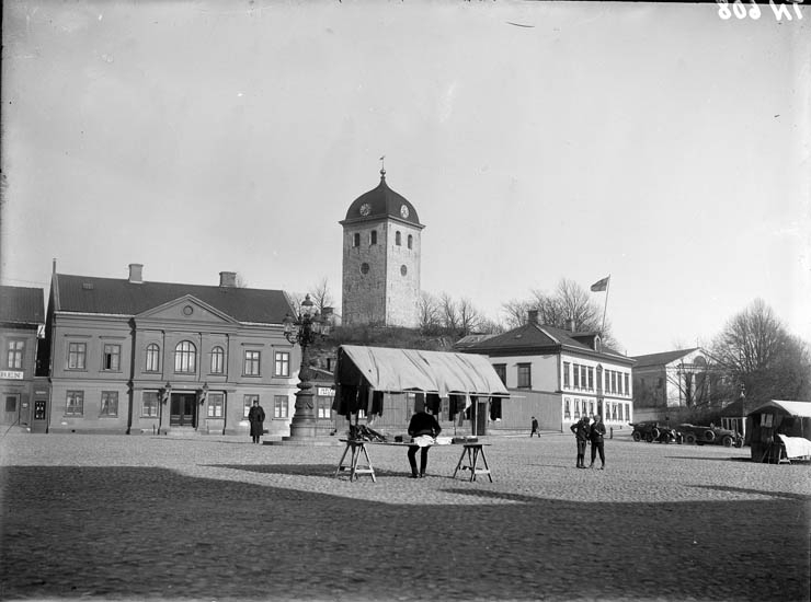 I bakgrunden Klocktornet. Mitt i bilden torghandel."