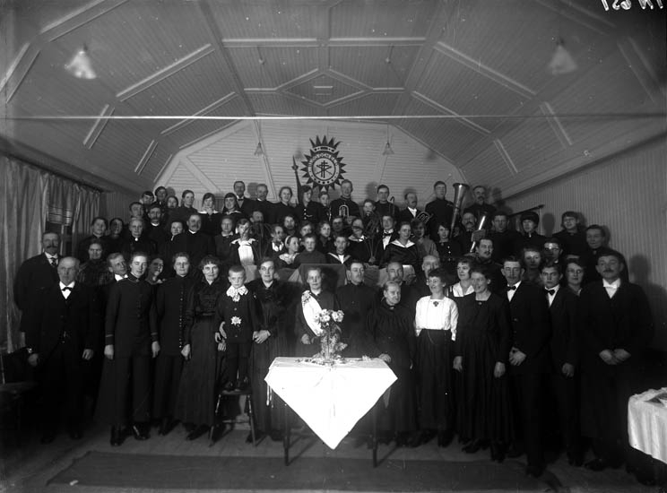 Enligt tidigare noteringar: "Gruppfoto vid möte i Frälsningsarmens lokal. Armebröllop."